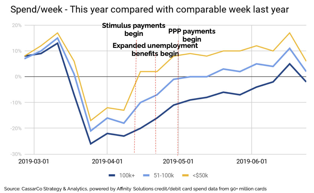 The data below shows total U.S. retail (excluding auto) and restaurant sales from credit and debit card data from my firm, CassarCo Strategy & Analytics, between March and June 2020 compared with the same weeks in the prior year. We see a huge decrease in spending by all income groups in the early stage of COVID lockdowns followed by a sharp rebound in spending as stimulus payments were released.